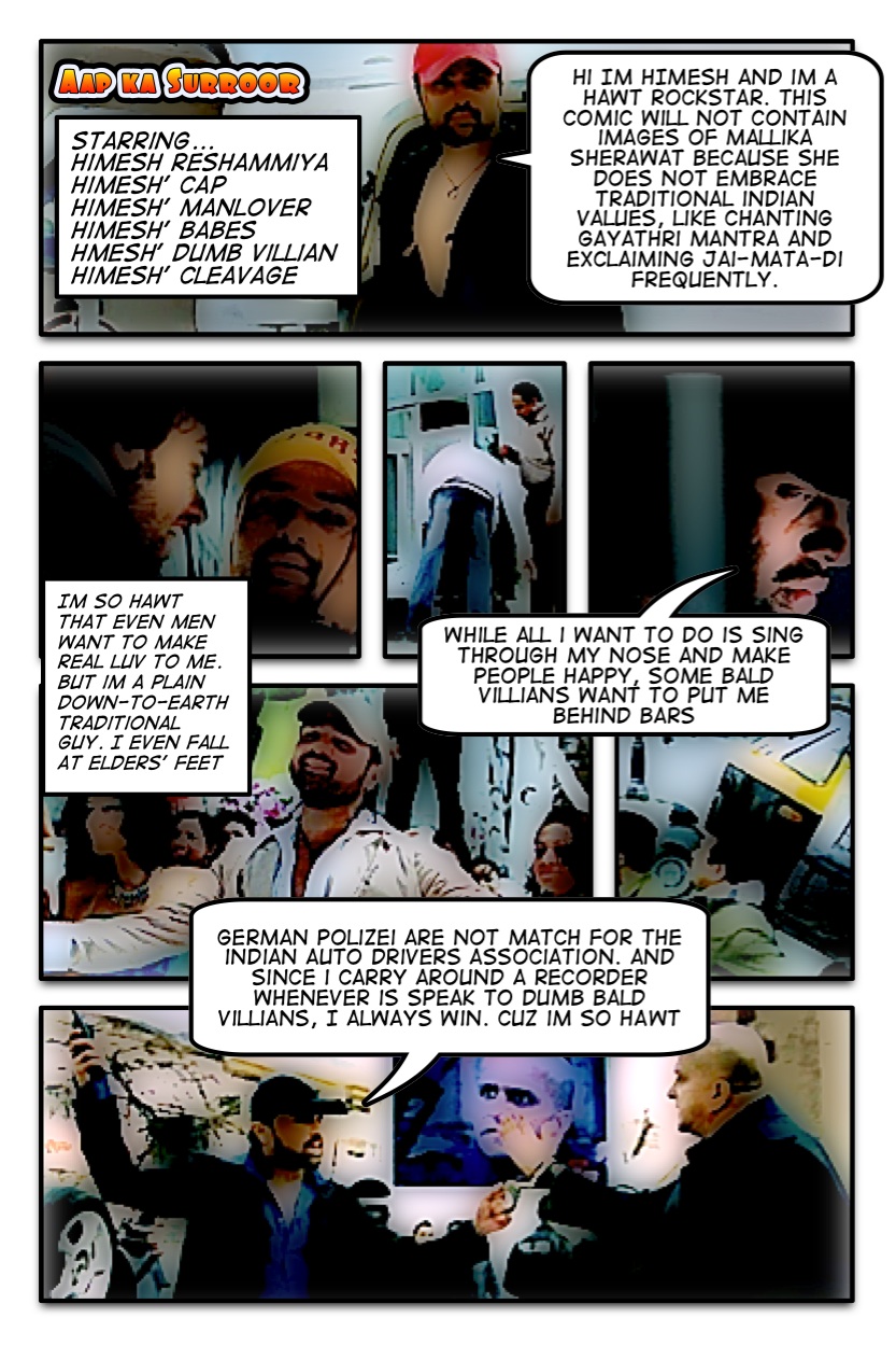 And Himes, your songs totallyt rawk. Peepuls say you sing thru your nose, but they nose nothing. Heh Heh. See Himes, pun. I normally don’t believe in rituals but when you held the gitaar and sang Gayathri Mantra na, I was like, totally feeling spiritual, patha hai? I will take my gitaar and say the Gayathri Mantra averyday from now. See peepul, Himes is having such a pojitive affect on me.So for all these dumb criticizing peepuls like Greatbong, I made this one page cartoon comic of the Moviee. Criticizing peepuls need such simplicity to understand the real luv of Himes.