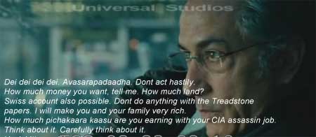 So what’s different, one might ask. For one, the Bourne movies are intelligent action movies, unlike the Die Hard series, that was designed for an audience that keeps its mind in standby mode while being bombarded with explosions, appa-ponnu sentiment and bombastic dialogue. Bourne Ultimatum on the other hand keeps one on the edge and yet makes you think all the time. The plot is not exactly laid out like a plate of masala dosa that just screams “eat me”. It’s more like they give you paruppu podi, boiled rice, ghee and vattha kuzhambu and expect you to figure out the optimum combination, and when one gets it, it sure is tasty. Let me give you an example.