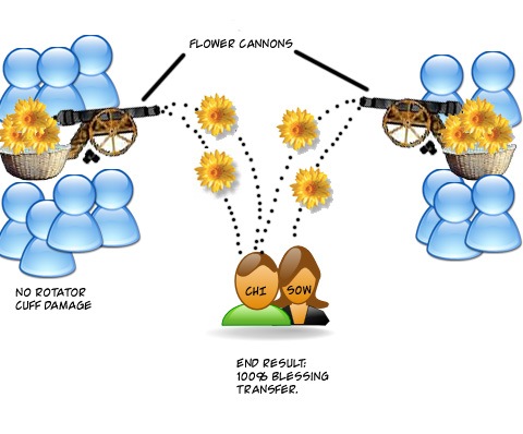 Elderly folks at weddings are usually handed flowers which they go on to bless and then exercise their rotator cuff muscles to hurl aforementioned plant reproductive parts in the hope that the blessed object will make contact with the couple seated on the medai and initiate a benediction transfer process.