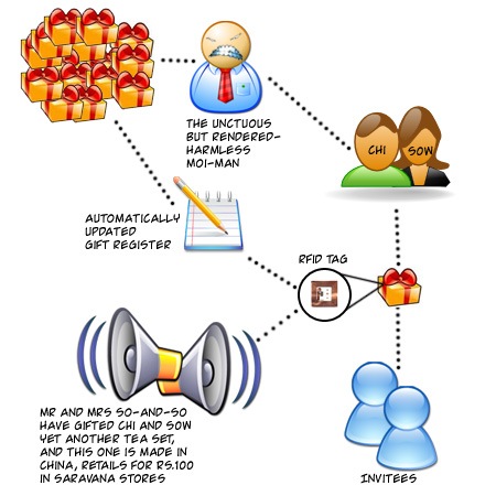 RFID tags can be used to identify and track gifts. So a small loudspeaker system that announces “Mr and Mrs So-and-So have gifted yet another tea set” should discourage people from being lazy gifters in the future.