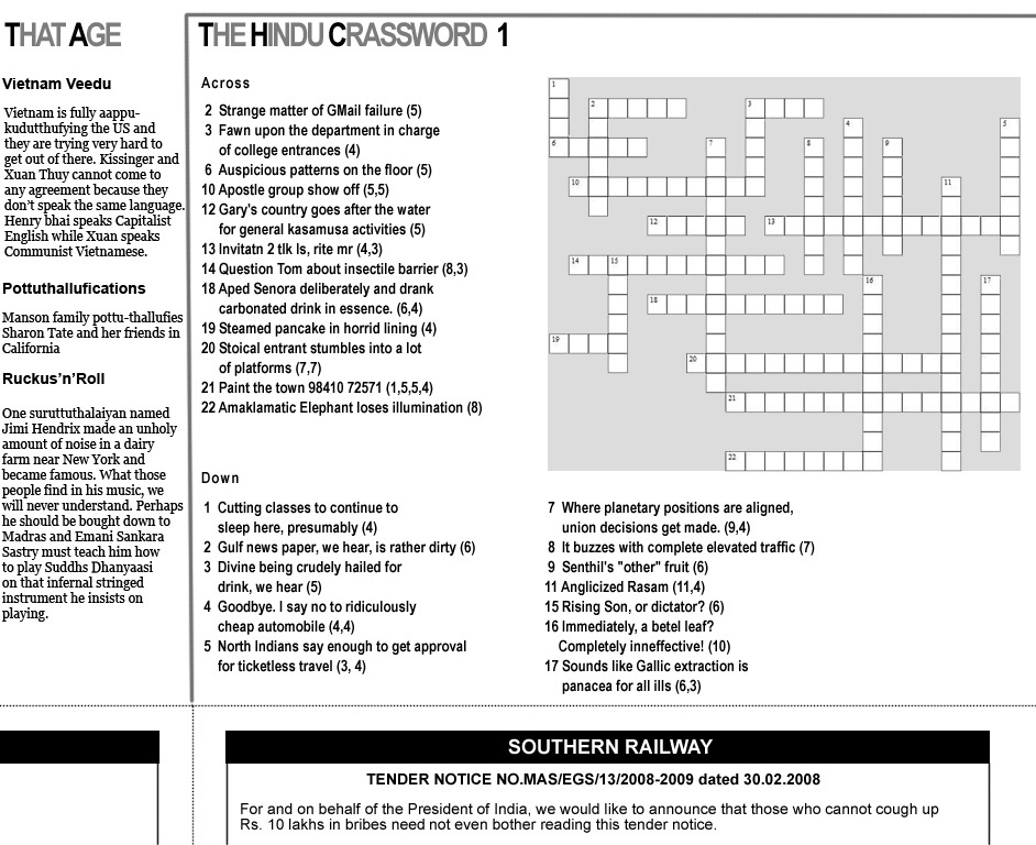 For e.g. how would we design a Chennai-centric, contemporary English cryptic crossword for The Hindu? Plis to excuse for the poor quality clues and shady crossword structure for I am not a pro at crosswords. Perhaps she should start doing this.