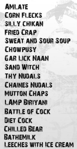 I have a confession to make. Over the years, I have logged an untold number of person-hours LOL-ing, ROFL-ing, ROFLOL-ing, taking mobile cam shots and showing to friends and ROFL-ing together at unintentionally funny spellings in Indian restaurant menus. And since we are talking about food, I thought it might be appropriate to invoke thy holy noodly presence and share my thoughts with you.