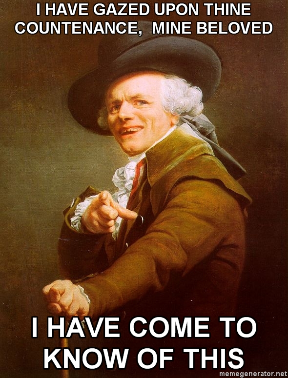 So my search continued for Indianizable internet memes. I came across the Archaic Rap meme. It’s an image-macro type meme where rap/pop song lyrics transcribed in archaic english are layered over Joseph Ducreux’ deliciously bizarre paintings from the 18th century. Since pictures speak 1K – 24 words and all that, this is what I’m talking about