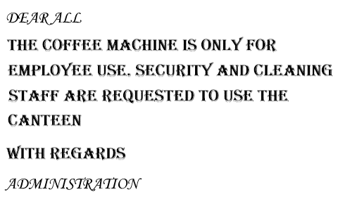 The guard dutifully squinted at our ID cards and used advanced CSI like techniques in his brain to age-advance and match the faded 15 year old photo of my manager (with a full head of hair) with his current dopey-eyed bald look. Satsified, he opened a dusty cupboard with a small key and let us have our plastic cups. He also made us fill a “Cofee Register” with fields such as name, employee number, number of cups, date, time, signature and for some reason, “remarks” as well.